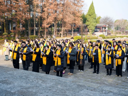 在李时珍纪念馆前的广场上,全体参与者统一着黄色主题的披肩,集体祭拜李时珍,并向李时珍雕像敬献鲜花。
