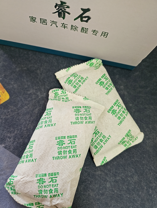 2.空间吸附(主力:睿石):在喷涂沐光蓝的同时,将睿石以每10-15平方米一公斤的密度,分散放置于各个房间的角落、家具顶部、床下等位置。睿石强大的吸附能力可以快速捕获空气中已释放的游离甲醛,降低整体浓度。