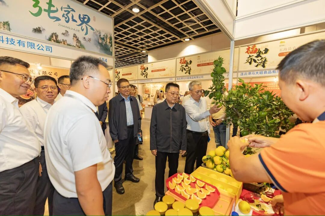 图|江苏省人民政府副秘书长、办公厅主任谢润盛来到秭归展台前了解脐橙产业发展情况